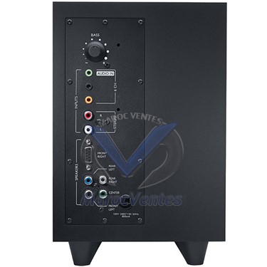 L'alimentation, le contrôle du volume et la prise casque se situent sur le haut-parleur avant droit; le contrôle des basses se situe à l'arrière du caisson de basses - Plus d'images (4)