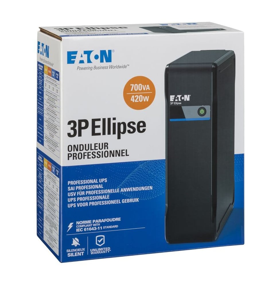 Onduleur Off-line 3P Ellipse 3P700F - 420 W / 700 VA - 4 prises FR. Tension (sortie/entrée): 230 V par défaut (220/230/240 V) / 230 V par défaut (220/230/240 V) Connexions de sortie: (3) françaises, (1) françaises - surtensions uniquement Connexions d'entrée: (1) IEC-320-C14 Phase (sortie/entrée): 1 / 1 (Eaton 3P700F)