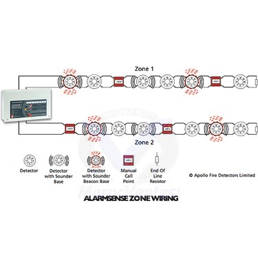 - Deux circuits de zone AlarmSense - compatibles avec les détecteurs, les points d'appel, les avertisseurs sonores et les indicateurs visuels ApollSense d'Apollo.
