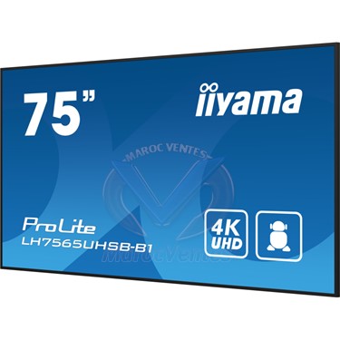 Écran 75" avec résolution 4K et dalle 800cd/m² pour une communication optimale et des images lumineuses et éclatantesCréez des contenus dynamiques et attrayants conçus pour capter l'attention de votre public. Avec une luminosité de 800 cd/m², le LH7565UHSB peut être utilisé en orientation paysage ou portrait dans des environnements 24/7 sans aucune interférence. Sa polyvalence peut être personnalisée pour répondre aux besoins d'affichage de votre secteur. Le système d'exploitation Android 11 intégré permet de personnaliser facilement l'écran et d'exécuter de manière transparente une variété d'applications tierces, y compris de multiples plateformes CMS.Le système de gestion de contenu iiSignage² intégré permet un contrôle total des messages et des publicités à distance et en toute sécurité. La fonction Signal FailOver garantit que le contenu est activement affiché via les entrées sélectionnées dans les environnements critiques. Un module WiFi intégré (et remplaçable) permet à cette série d'être prête pour la diffusion de contenu à distance sur le réseau.L'application EShare facilite la création d'idées et la collaboration efficace au sein d'une entreprise ou d'une école. Le partage sans fil n'a jamais été aussi simple.Vous cherchez un écran capable de donner vie à des contenus aussi bien dans une salle de réunion que dans un hall d'aéroport ? Faites connaissance avec l'iiyama ProLite LH7565UHS-B1 ! Cet écran de 75’’, c'est l'outil idéal pour afficher des visuels au format portrait et paysage ! Avec son système de connectique complet, libre à vous de lui ajouter des éléments visio ou autres accessoires ! Encore plus pratique, la télécommande vous permet de régler les paramètres de l'écran d'une main de maître !Visionnez l'intégralité de vos contenus multimédia sans interruption grâce à ses capacités de fonctionnement 24/7 ! Outre cela, l'alliance de sa résolution 4K et de sa haute luminosité de 800cd/m² autorise l'écran à offrir des images incroyablement fines et pointues. Idéal dans les commerces grâce à sa fonction de détection automatique du signal sur les sources d’entrée FailOver, il convient également aux entreprises, ses 2 haut-parleurs de 10W chacun se prêtant parfaitement à la réalisation d’échanges à distance.Utilisez la fonction EShare pour diffuser du contenu depuis un appareil Windows, iOS ou Android, en sans-fil ! Fonctionnant sous Android 11, cet écran est personnalisable à l'infini : installez vos applications favorites pour disposer d'un support 100% adapté à vos besoins ! Cerise sur le gâteau : toute la création, gestion et publication transite via un seul et même logiciel : iiSignage 2, de quoi gagner en productivité au quotidien !Android OS