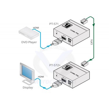 Le PT−571 est un émetteur paires torsadées DGKat™ pour signaux HDMI. Le PT−571 convertit un signal HDMI au format paires torsadées et le récepteur PT−572+ restitue le signal HDMI d'origine.Débit de Données Maximum — 4.95Gbps (1.65Gbps par canal graphique).Compatible HDTV. Conforme aux Normes HDCP. Intégration de Signal DGKat ™ — La technologie Kramer pour la conversion des TMDS et le contrôle des signaux passent par des câbles de paires torsadées. Nous recommandons fortement l'utilisation des câbles Kramer DGKat™ conçus spécifiquement pour une performance optimale.Support HDMI.Système 3D.Portée du Système — Jusqu'à 90m(295ft) en 1080i, ou jusqu'à 70m(230ft) en 1080p avec le câble blindé BC–DGKat623.Jusqu'à 100m(330ft) en 1080i ou jusqu'à 90m(295ft) en 1080p avec le câble blindé BC–DGKat7a23.Transmission des Données EDID — Transmission des signaux EDID entre la source et l'affichage. Voyant LED — S'allume rouge quand le produit reçoit uniquement l'alimentation, orange quand la sortie et l'alimentation sont reliés, et jaune quand une entrée active et sortie sont reliées.Système Power Connect™ — Une seule connexion à l'émetteur ou au récepteur permet d'alimenter les deux produits.Format Ultra–Compact Pico TOOLS™ — 4 appareils peuvent être montés côte à côte en baie 19 pouces, hauteur 1U, avec l'adaptateur RK–4PT.APPLICATIONS