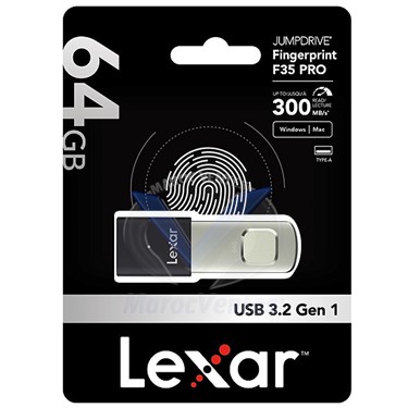 Lexar JumpDrive Fingerprint F35 Pro Clé USB 3.0 64 Go, jusqu'à 300 Mo/s en lecture/150 Mo/s en écriture, clé USB, 10 identifiants d'empreintes digitales autorisés, clé mémoire (LJDF35P064G-RNBNG)Clé USB 3.2 Type A, rétractable, 64 GoVerrouillage par empreinte digitaleLinux, Mac et WindowsVitesse de lecture : 300 Mo/sVitesse d'écriture : 150 Mo/s - Plus d'images (1)