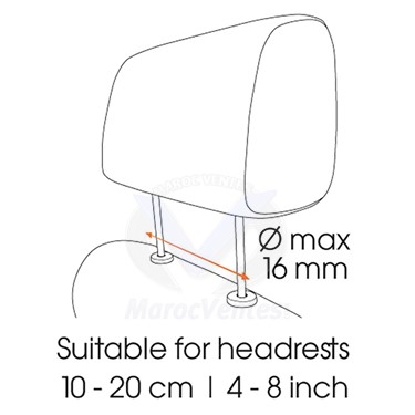 Le support de tablette est adapté à tous les véhicules dotés du système universel de réglage en hauteur de l'appui-tête. Il est flexible pour une utilisation avec différentes largeurs entre les tiges de l'appui-tête. Le support ne peut pas être monté sur des appuie-tête où les tiges ne sont pas visibles, comme c'est par exemple le cas dans les voitures Tesla.Spécifications