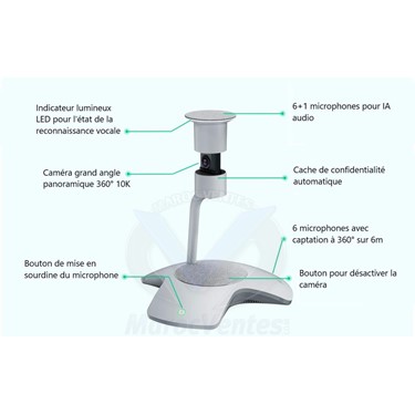 Caméra 360° : OuiNombre de participants possibles : Jusqu'à 10 participantsAffichage en vignette des participants : OuiObstructeur automatique de la caméra : OuiNombre de microphones : 6 microphones omnidirectionnelsPortée des micros : 6 mètresHaut-parleur intégré : OuiMode Muet : OuiCertifications : Microsoft Teams RoomsAssistant Vocal : Oui, Cortana.SPECIFICATIONS