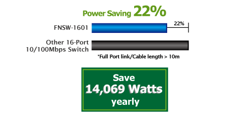 La puissance des balances intelligentesest un algorithme intelligent qui détermine activement le niveau de puissance approprié en fonction de la longueur du câble. Le FNSW-1601 détecterait automatiquement la longueur du câble Ethernet et ajusterait la consommation d'énergie en conséquence. Le dispositif connecté peut réduire considérablement la consommation d'énergie globale, ce qui contribue de manière significative aux économies d'énergie. Le FNSW-1601 utilise un nouveau moteur qui permet une économie d'énergie jusqu'à 22% moins d'énergie tout en conservant des performances élevées.