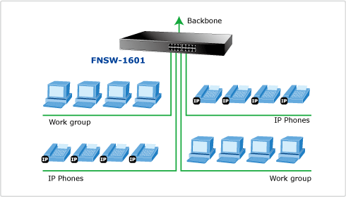 Uplink directement par un câble droit ou croisé à l'interrupteur de backbone, le FNSW-1601 fournit la connectivité à l'arrière plan tout en segmentant le trafic réseau du département à votre backbone.