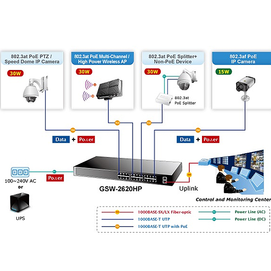 Le GSW-2620HP permet de transférer des données et de bénéficier d'un PoE élevé en une seule unité, réduisant ainsi le besoin de câbles et de prises de courant prolongés au mur, au plafond ou à tout endroit inaccessible. Cela permet de réduire les coûts d'installation et de simplifier les efforts d'installation. Toutes les interfaces cuivre RJ45 du GSW-2620HP prennent en charge la négociation automatique à 10/100 / 1000Mbps pour une détection optimale de la vitesse via des câbles RJ45 de catégorie 6, 5 ou 5e. Il prend également en charge le standard auto-MDI / MDI-X, capable de détecter le type de connexion à tout périphérique Ethernet sans nécessiter de câbles spéciaux droits ou croisés.Solution d'extension flexible