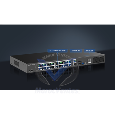 Reyee Switch PoE Cloud Administrable L2 - 24 ports PoE 802.3af/at + 2 SFP - 24 RJ45 10/100/1000Mbps + 2 SFP 10/100/1000 - 30W par port 802.3af/at / Maximum 370W - VLAN/Port Isolation/Loop Detection - Port Speed Limit