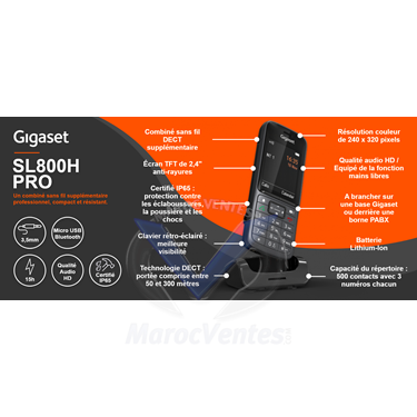 Le Gigaset SL800 Pro est conçu pour vous accompagner tout au long de vos journées de travail. C'est un des combinés les plus compact, tout en étant l'un des plus autonomes avec ses 15H de fonctionnement en conversation et plus de 300 heures d'appel entre 2 recharges.Ses dimensions mini de 13 x 5,1 x 1,8 cm lui permette de se glisser discrètement dans votre poche.Son grand écran couleur de 6,1 cm (2,4 pouces) rend la navigation dans les menus très facile. Vous pourrez naviguer à travers le répertoire de 500 contacts avec un affichage aussi agréable que sur un smartphone.Aussi compact soit-il, les boutons sont très bien agencés pour composer les numéros très rapidement.Sa finition en ABS gris du plus bel effet lui permet de s’intégrer dans n’importe quel bureau de direction ou open-space.Parce que Gigaset a pensé à tout, ce combiné sans fil résiste à la poussière (norme IP20), mais surtout aux désinfectants type liquide hydroalcoolique.Fourni avec sa base de recharge, elle aussi très compacte, le Gigaset SL800 tient à la verticale avec un écran bien visible. Pour plus de flexibilité, Gigaset a muni son SL800H d’un connecteur microUSB pour le recharger avec un chargeur de smartphone.Toujours pratiques, les kits mains libres filaires fournis avec les smartphones sont compatibles avec ce combiné téléphonique professionnel : il dispose d’une prise jack 3,5 mm sur le côté.Pour continuer de vaquer à vos activités, le SL800H vous donne toutes les possibilités :Mains libres intégrées avec un haut-parleur audio haute définition qui vous suivra partout, attaché à votre ceinture avec le clip ceinture fourniKit mains libres filaires mono ou stéréo sur prise jack 3,5Micro casque sans fil Bluetooth pour une liberté totaleGrâce au Bluetooth intégré, il peut même être appairé à une enceinte de conférence (speaker phone)Il est autant adapté aux métiers de bureau (secrétaire, assistante de direction, sténodactylo…) qu’aux métiers de la santé (médecin, infirmier, kinésithérapeute…).Ne craignez pas de composer un faux numéro par inadvertance : vous pouvez verrouiller les touches avant de le glisser au fond de votre poche. Pour plus de sécurité, vous pouvez définir un code PIN qui ne donnera accès qu’à vous seul.Ce combiné DECT ajoute la touche technologique dans les suites et chambres de votre resort. Son design, sa discrétion, sa compacité lui permettent de s’intégrer aussi bien sur une table de chevet que sur un bureau.Toutes les fonctions de paramétrage peuvent se verrouiller, lui offrant la compatibilité avec les ERP. Le mode hôtel ne s’arrête pas là : la liste des derniers appels (reçus ou appelés) s’efface automatiquement à intervalle régulier pour conserver la confidentialité de vos clients.Le client peut simplement changer la langue du menu de l’appareil ; une fois parti, vous pourrez tout aussi simplement restaurer les paramètres de base via un code de réinitialisation.Compatible avec les bornes DECT, le SL800H Pro permettra à vos clients de fiabiliser leurs appels à travers tout votre établissement.Sa capacité à être nettoyer avec des solutions hydroalcooliques lui permettent de respecter les normes sanitaires de votre établissement hôtelier et désinfecter en profondeur votre combiné entre chaque client.Compact et puissant, le combiné Gigaset SL800H Pro DECT offre une expérience téléphonique avancée. Doté d'un grand écran couleur anti-rayures de 6,1 cm, de la fonction Bluetooth pour les appels sans fil via casque, et d'un haut-parleur main libre avec audio HD, il garantit une communication claire et confortable. Sa batterie Li-Ion assure jusqu'à 15 heures d'autonomie, idéale pour une utilisation intensive. Avec sa protection contre la poussière (norme IP20) et la compatibilité avec le nettoyage au gel hydroalcoolique, ce combiné allie performance et sécurité au quotidien, parfait pour les environnements professionnels exigeants.Les principales fonctions disponibles :