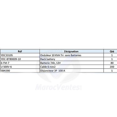 1 - Onduleur 10KVA TRI sans battérie2 - Rack Battérie3 - Battérie 7Ah,12V4 - Cable 6mn25 - Disjoncteur 3P 100AYDC3300 series UPS is a three-phase in and three-phase out high frequency UPS with medium and large power capacity. Equipped with three-level inverter topology, it results in high efficiency reaching 95.5%. With higher power density, smaller footprint, it takes the leading position in the UPS industry with same power capacity; Adopting unique power unit redundancy design technology, decrease the abnormity risk of system after single-point failure, greatly increase the system reliability. For user, it is your best choice with high investment rate.Features