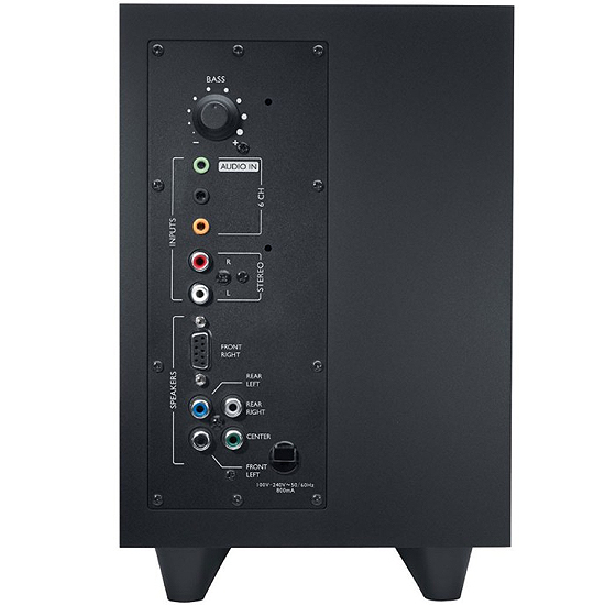 L'alimentation, le contrôle du volume et la prise casque se situent sur le haut-parleur avant droit; le contrôle des basses se situe à l'arrière du caisson de basses - Plus d'images (4)