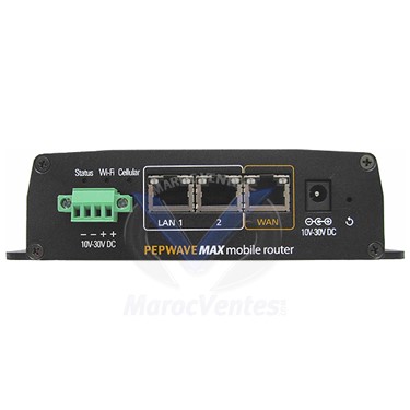 LogicielPepwave MAX FirmwareWANSupport pour PPPoE, IP statique, DHCPVérifier WAN Health LinkBande passante Allocation MoniteurLe soutien aux services DNS dynamiquesPort WAN convertible dans le port LANLANServeur DHCP pour les clients LANOption DHCP avancéeRéservation DHCPDNS proxy pour les clients LANVLAN on LANRéseautageNAT et le routage IPRoutes statiquesPort ForwardingBeaucoup One, One to One NATNAT PiscineSIP ALG, H.323 ALGUPnP, NAT-PMPServeur WINSSolution VPN completPepVPN / SpeedFusion Hot basculementSite-à-site VPNBasculement transparent256-bit AESL'authentification par clé pré-partagéeRoutage dynamiquecertificat X.509 supportIPsec VPN (réseau-réseau)SécuritéPare-feu StatefulPrévention DoSCaptive Portal soutienSoutien aux clients LAN câblés et sans filAuthentification support RADIUSTemps et l'utilisation des quotas sur le mode Open AccessConstruit en page de démarrage personnalisableQoS avancéeGroupes d'utilisateursLimite de bande passante individuelleHiérarchisation de l'applicationSIP, HTTPS, VPN QoSApplications personnalisées QoSSystème de Positionnement Global (MAX-BR1-GPS)GPS intégréDispositif Carte de localisationLieu des données de suiviFonctionnalité de gestion de flotteGestion des périphériquesInterface Web d'administrationCommand Line InterfaceGestion InControl CouvertureNotification par emailListes de clients actifs et de sessionStatistiques d'utilisation de bande passanteReporting Services WebService syslogSNMP v1, v2c et v3Exigences d'alimentationEntrée universelle100V - 240V ACContenu de l'emballageMAX BR112V Power Supply1x 5dBi magnétique Wi-Fi Antenne1x antenne GPS magnétique2x 2 dBi 4G LTE Antennes (4G LTE)Antenne magnétique 1x 3dBi 3G (3G)CertificationsFCC, CE, RoHSChocs et vibrations Résistance - EN 61373:1999 IEC 61373:1999Port RF éclairage immunité - Recommandation UIT-T K.20 (+ / - 1,5 kV)CaractéristiquesModem 4G embarqué, bascule automatiquement en WAN par Ethernet ou Wi-FiVPN incassable avec SpeedFusion, redirige instantanément et de manière transparente le trafic entre le réseau WAN 3G et le filaire si l'un des deux est défaillantWi-Fi 802.11n, commutable WAN ou en point d'accèsUne résistance de qualité industrielle, la température supportée va de -40° à 65°C, protection contre chocs et vibrations et protection décharges antistatiques/surtensions pour tous les portsGestion centralisée avec InControl - Suivez votre parc ou pour une configuration et une résolution de problèmes, où que vous soyez et à tout moment - Plus d'images (2)