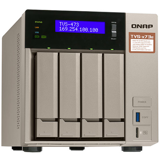 Le TVS-473e est alimenté par un APU haut de gamme AMD série R qui embarque des performances exceptionnelles grâce au processeur et à l'unité graphique AMD Radeon R7. Il constitue ainsi une solution NAS éco-énergétique de haute performance. Conçu avec un design métallique dernier cri et arborant une finition or du plus bel effet, le TVS-473e dispose de capacités élevées avec une extensibilité PCIe, le port USB QuickAccess unique, une sortie HDMI 4K à 30 Hz, et une accélération du décodage et de l'encodage vidéo 4K H.264 pour une expérience audiovisuelle optimale.