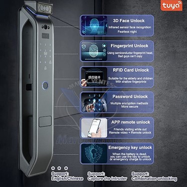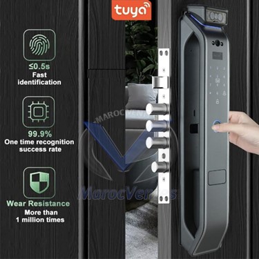 • Aluminum alloy• Dimension : 423x73mm• Déverrouillage Methode : 3D Face (Caméra Intégré ), Application Mobile Wifi , Mot de passe, Empreinte, Carte RFID, Clé Manuel , Port USB.• Quantité des empreintes, Cartse RFID,Mot de passes : ≤300• Quantité Face : ≤50• Power Supply : 7.4V 4200mAh Lithium -ion rechargeable batter• Compatibilité : Wooden door or Metal door• Application Mobile : Tuya Intercom APP WIFI APP or TT LOCK APP - Plus d'images (2)