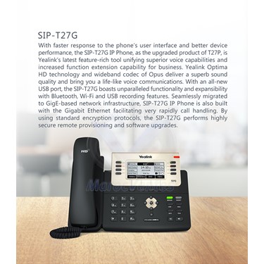 Le téléphone SIP Yealink T27G est un milieu de gamme avec des prestations haut de gamme.Fabriqué avec des matériaux de haute qualité, grand écran LCD graphique 240 x 120 pixels, offrant une expérience d'utilisation plus simple et agréable.Le T27G supporte 6 comptes SIP et des options d'installation simples, flexibles et sécurisées en plus de supporter les standards IPv6, Open VPN et fonctionne également avec les normes SRTP / HTTPS / TLS, 802.1x.Le Yealink T27G se caractérise par son interface d'utilisation intuitive et certaines fonctionnalités améliorées pour une plus simple utilisation et maximiser la productivité. Ce modèle comporte également 2 ports Gigabit Ethernet.Le Yealink T27G a une réponse plus rapide sur l'interface utilisateur du téléphone et une meilleure performance de l'appareil par rapport le téléphone Yealink T27P. Son outil est riche en fonctionnalités qui unifie les capacités vocales supérieures et augmente la capacité d'extension des fonctions.Grâce à sa technologie Yealink Optima HD et le codec large bande d'Opus, vous offre une qualité de son exceptionnelle et vous apporte une communication très réel.Avec un nouveau port USB, le Yealink T27G offre une fonctionnalité et une extensibilité sans précédent, qui est prêt pour les futures fonctions d'enregistrement Bluetooth, Wi-Fi et USB.Le Yealink T27G est une solution IP très rentable qui aide les utilisateurs à optimiser les processus de communications sécurisés dans les environnements de petites et moyennes entreprises.Caractéristiques