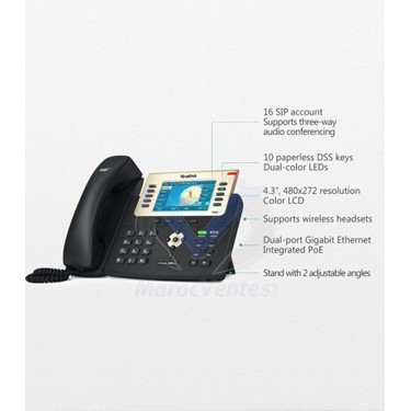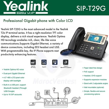 Le nouveau téléphone IP Yealink T29G a jusqu'à 16 comptes SIP, ainsi que 2 ports Gigabit Ethranet. Offre la possibilité de connecter plusieurs périphériques tels qu'un casque Bluetooth avec l'option dongle USB. Il dispose également d'un port USB. Son support de pied intégré avec 2 angles réglables permet le placement en fonction de l'utilisateur ou si vous préférez, vous pouvez aussi son montage mural.Sa qualité sonore est parfaite grâce à la technologie Yealink Optima HD. Il dispose d'un 4,3 pouces TFT haute définition qui permet de contrôler à tout moment des appels entrants. Il a également des touches programmables pour un usage plus facile pour l'utilisateur. Il offre également un large éventail de fonctions: mise en garde et le renvoi d'appel, appel en attente, renvoi d'appel, retour d'appel, conférence à 3 et l'enregistrement des appels.Caractéristiques