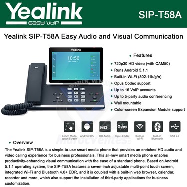 - Ecran tactile 7 pouces- Android 5.1.1- Bluetooth intégré 4.0 pour casques et appareils mobiles- Wi-Fi intégré- Port USB 2.0 pour casque USB, media et stockage- Prise en charge du codec Opus- Jusqu'à 16 comptes VoIP- Conférence audio jusqu'à 5 personnes- Support avec 2 angles réglables- Montage mural- Support de module d'expansion- Alimentation PoE- Conférence jusqu'à 5 participantsAudio• Voix HD: combiné HD, haut-parleur HD• Combiné compatible avec une aide auditive (HAC)• Codec audio: Opus, G.722, G.722.1, G .722.1C, G.711 (A / u), G.723, G.726, G.729AB, iLBC• DTMF: In-band, Out-of-band (RFC 2833) et SIP INFO• Aiguilles en duplex intégral mains libres avec AEC• Fonctions vidéo VAD, CNG, AEC, API, AJB, AGC (besoin de CAM50)• Appel vidéo HD à 720 @ 30fps• Codec vidéo: H.264 High Profile, H.264, VP8• Caméra Yealink CAM50: 2MP, plug and play, réglable, avec obturateur privé et indicateur DEL• Angle d'inclinaison verticale réglable: 50 °• Champ de vision (FOC): 70,2 °• Vue autonome (aperçu vidéo local)Affichage et indicateur• Écran LDC: écran tactile réglable capacitif de 7 "1024 x 600 Angle d'inclinaison vertical réglable: 48 °• Surface multipoint 5 points• Écran de veille et papier peint• Voyant pour l'indication des appels en attente• Interface utilisateur intuitive avec icônes et touches programmables• Interface utilisateur multilingue• Identification de l'appelant avec nom, numéro et photo LeProduit comprend• Téléphone IP Yealink SIP-T58A• Combiné avec cordon du combiné• Câble Ethernet (2 m) Câble FTP CAT5e)• Support• Guide de démarrage rapide - Plus d'images (3)