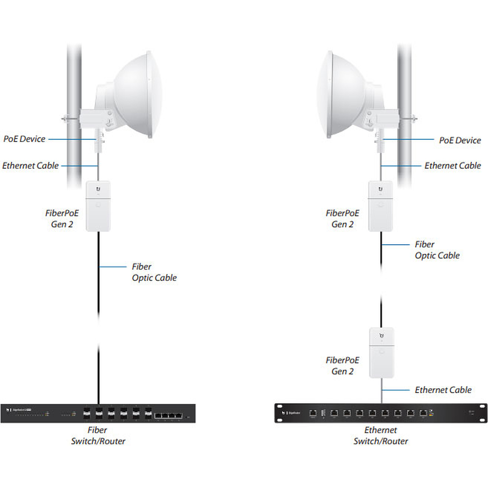 Ubiquiti FiberPoE Gen 2 est une solution à faible coût pour les déploiements en extérieur qui nécessitent des parcours longue distance pour atteindre le périphérique PoE. Les déploiements avec FiberPoE Gen 2 offrent une protection EMI et ESD significative sur les installations PoE typiques. Le FiberPoE Gen 2 dispose également d'un facteur de forme durable et résistant aux intempéries et d'une protection améliorée contre les surtensions. Avec le FiberPoE Gen 2, les données et l'alimentation sont transportées sur des câbles séparés pour améliorer considérablement l'intégrité des données et permettre des parcours de câbles beaucoup plus longs.